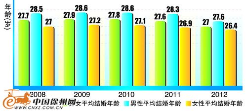 中国徐州网-都市晨报讯(记者 张利英 制图/邵晴)“我市年轻人一般多大年龄结婚,多大岁数才算‘剩男剩女’?”昨日,记者从市民政局社会事务处获悉,去年我市新人平均年龄为27岁,其中,男性27.6岁、女性26.4岁,男女平均年龄差较前年缩小0.2岁。与此同时,14000多名男性娶了小娇妻,数字谐音日“赶吉”领证连续5年受追捧,五成市民赞成“先立业后成家”。