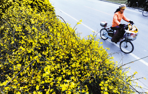 近日,我市天气渐暖,春光明媚,湖东路边的大片迎春花竞相开放。