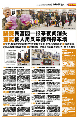 中国徐州网-都市晨报讯(记者 林熙生)因业主李先生拒向东苑农贸市场交卫生费,6日早上,他位于德政路三中附属初中对面人行道边的报亭,被人用叉车拉进一个停车场内。对该市场的收费行为,云龙区物价局昨日依法进行了查处。