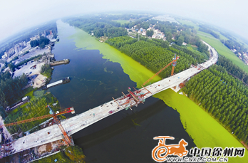 “新桥全长572.28米,主跨120米,是目前徐州市单跨跨径最长大桥。桥宽12米,两侧引线约2公里,设计时速60公里/小时,设计最高通航水位28.54米,引桥和主桥均采用钻孔灌注桩施工工艺。”贾汪区交通运输局相关人士介绍,该工程自2014年7月开工,按照今年10月1日通车的目标,抢排工期,加快项目建设进度,各项工作进展顺利。