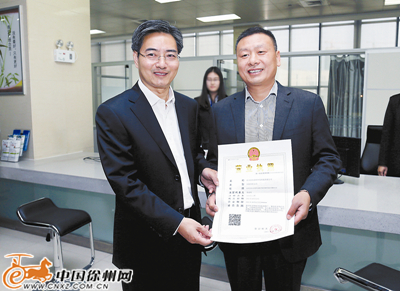 中国徐州网-徐州日报讯(记者 魏宁)10月12日,徐州国鼎盛和环境科技有限公司法定代表人李存叶从市长朱民手中接过了我市加载统一社会信用代码的营业执照。当天下午,朱民一行视察我市商事登记制度改革暨颁发“一照一码”营业执照情况。王安顺参加活动。